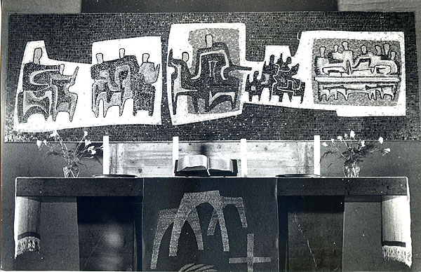 Das Mosaik von 1963 bezieht sich auf den Bibeltext Lukas 14, 16-24: